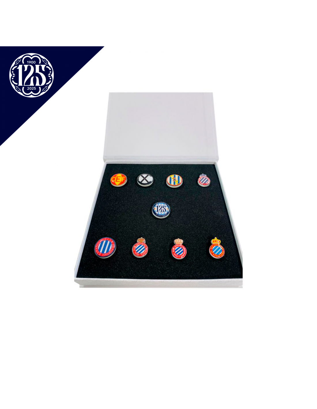 Reviu la història del RCD Espanyol a través dels seus símbols amb aquesta caixa commemorativa de pins, creada per a celebrar el 125 aniversari del club. Una col·lecció única que recorre l'evolució de l'escut al llarg dels anys, des de les seves primeres versions fins a l'emblema actual.