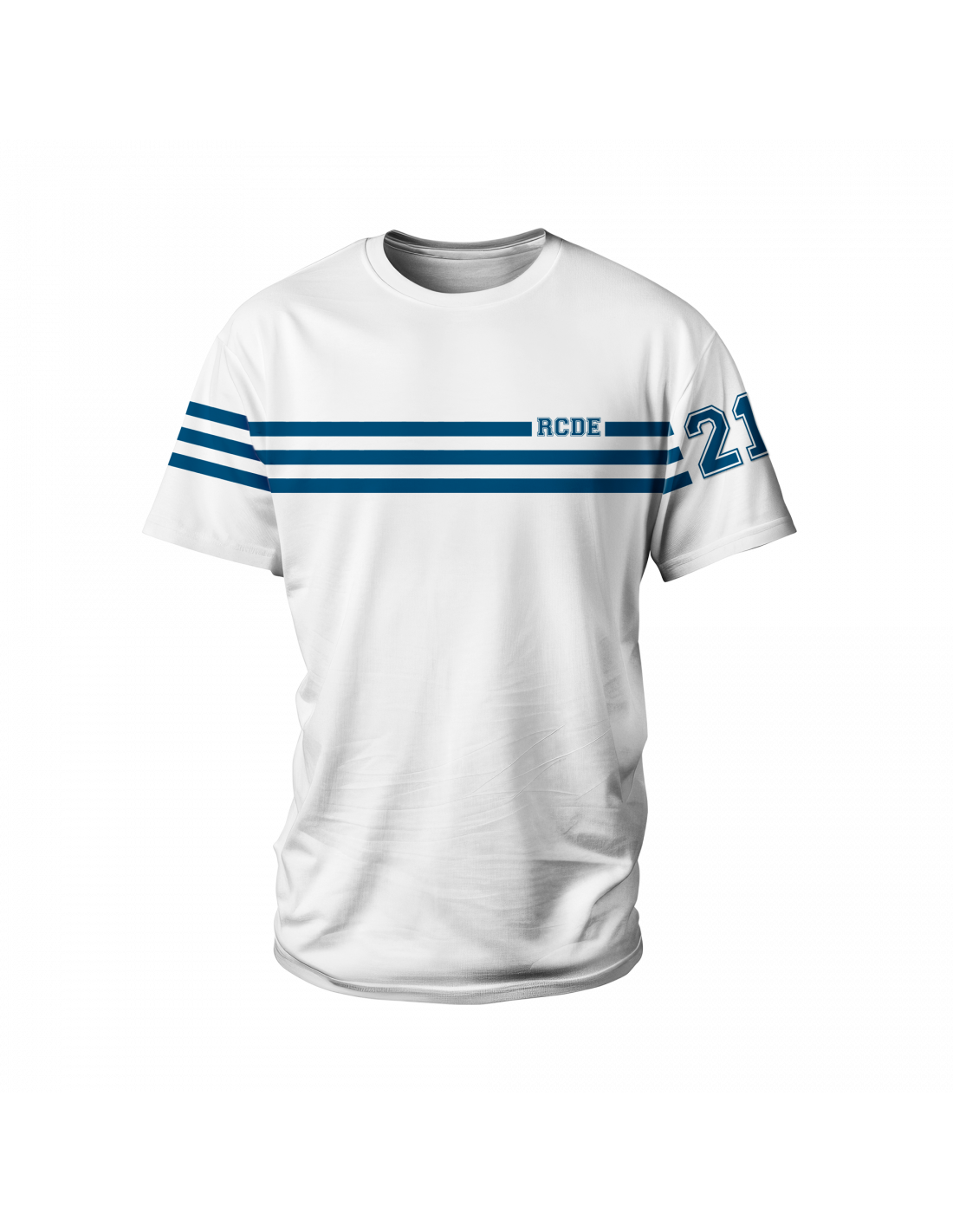 El seu blanc profund es combina amb tres línies blaves horitzontals que recorren el pit, on destaca el distintiu "RCDE". En la màniga, el número 21 brodat afegeix un toc de caràcter i orgull, convertint-la en una peça única per als veritables seguidors.