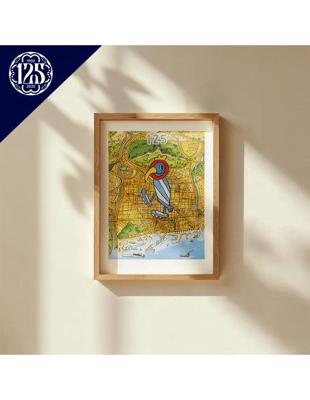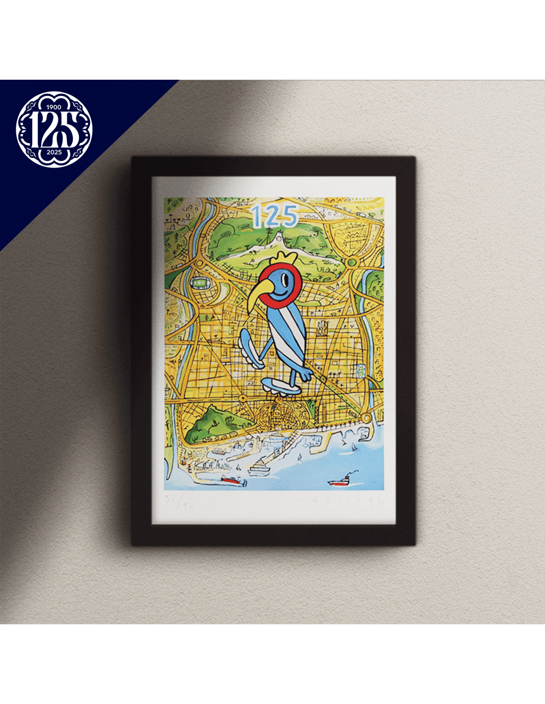 Celebrate the 125th anniversary of RCD Espanyol de Barcelona with a unique lithograph created by the artist Javier Mariscal, capturing the history, passion, and blanquiazul spirit in every detail.