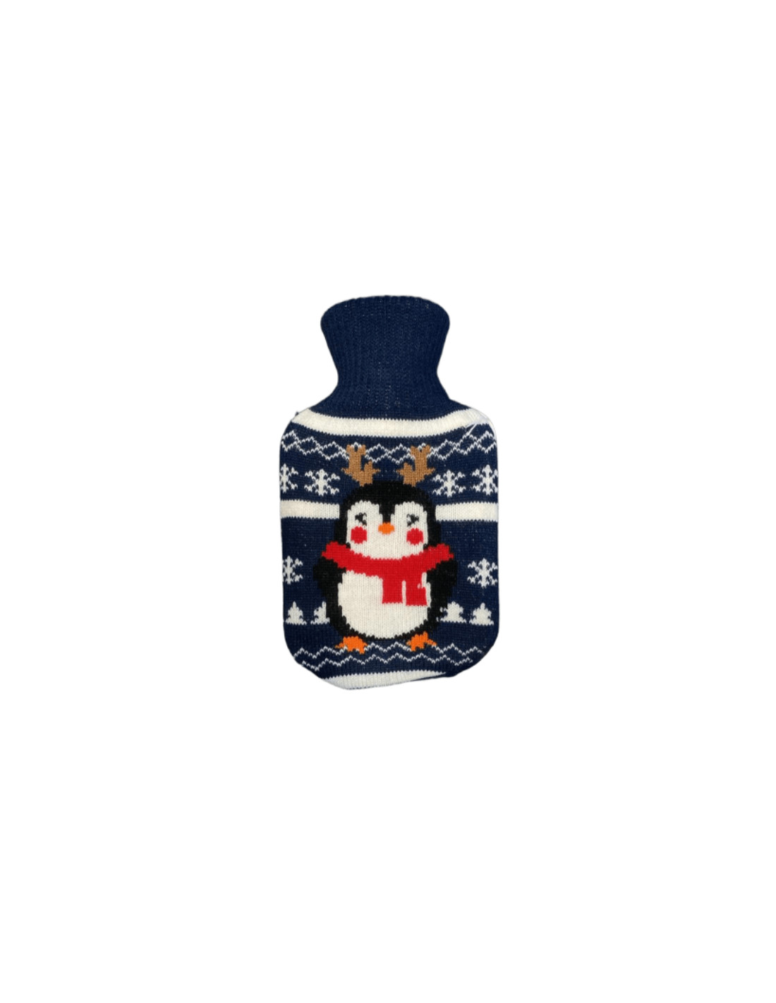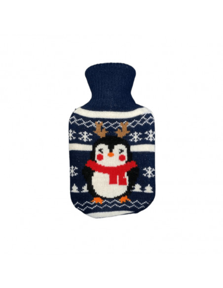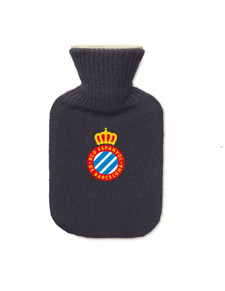 Official RCD Espanyol de Barcelona hot water bottle featuring the club crest. The back includes a charming Christmas-themed design with a penguin, adding a festive and cozy touch.