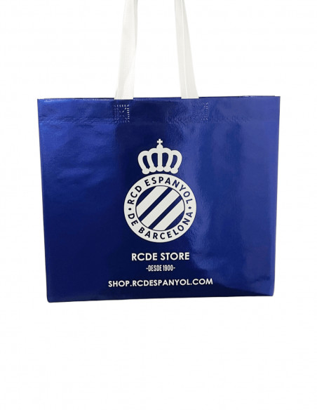 Small metallic blue bag from RCD Espanyol, lightweight, shiny and reusable.