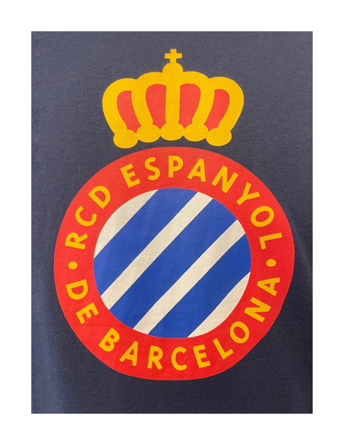 Official winter pajamas of the RCD Espanyol de Barcelona in navy, with the club’s shield on the center of the t-shirt and a shield pattern on the pants.