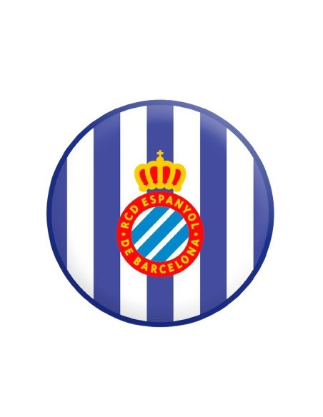Round magnet opener with the RCD Espanyol shield and blue and white stripes in the background.