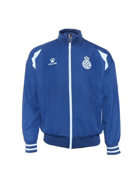 The RCD Espanyol de Barcelona junior pre-match tracksuit jacket in navy blue is the garment that accompanies our players in the moments before stepping onto the pitch.