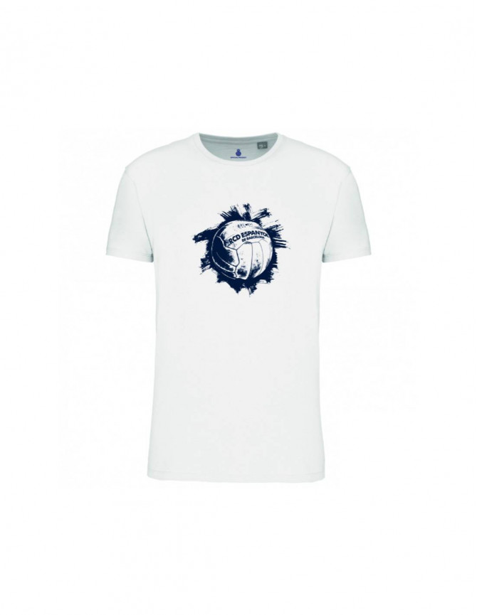 Its design features a striking central graphic in white with a vintage ball, accompanied by the name of RCD Espanyol de Barcelona, on a navy blue base that conveys strength and elegance.