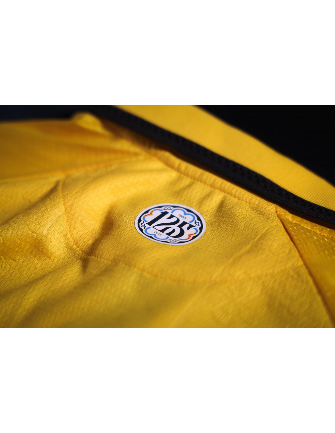 125 años después rendimos homenaje a estos primeros pioneros con esta camiseta conmemorativa, con el amarillo y negro como colores primordiales, tal y como se lucieron en la primera equipación de 1900. Entre los detalles de la camiseta, de corte retro, podemos observar el tramado del trébol de cuatro hojas, proveniente de aquella primera noticia de Los Deportes y de estilo art noveau, así como ese mismo artículo fundacional, que aparece íntegro en la zona del pecho.