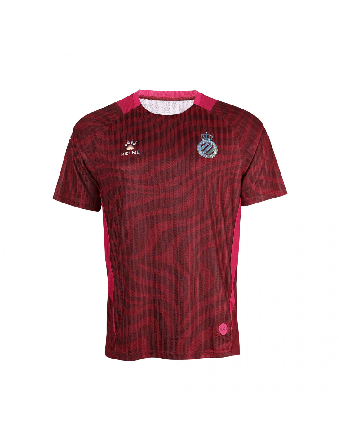 Camiseta de entrenamiento color bourdeos presenta detalles fucsias en laterales y costuras aportando un toque vibrante y moderno al diseño, incorporando la novedad de poder lucir nuestro escudo con acabado gloss.