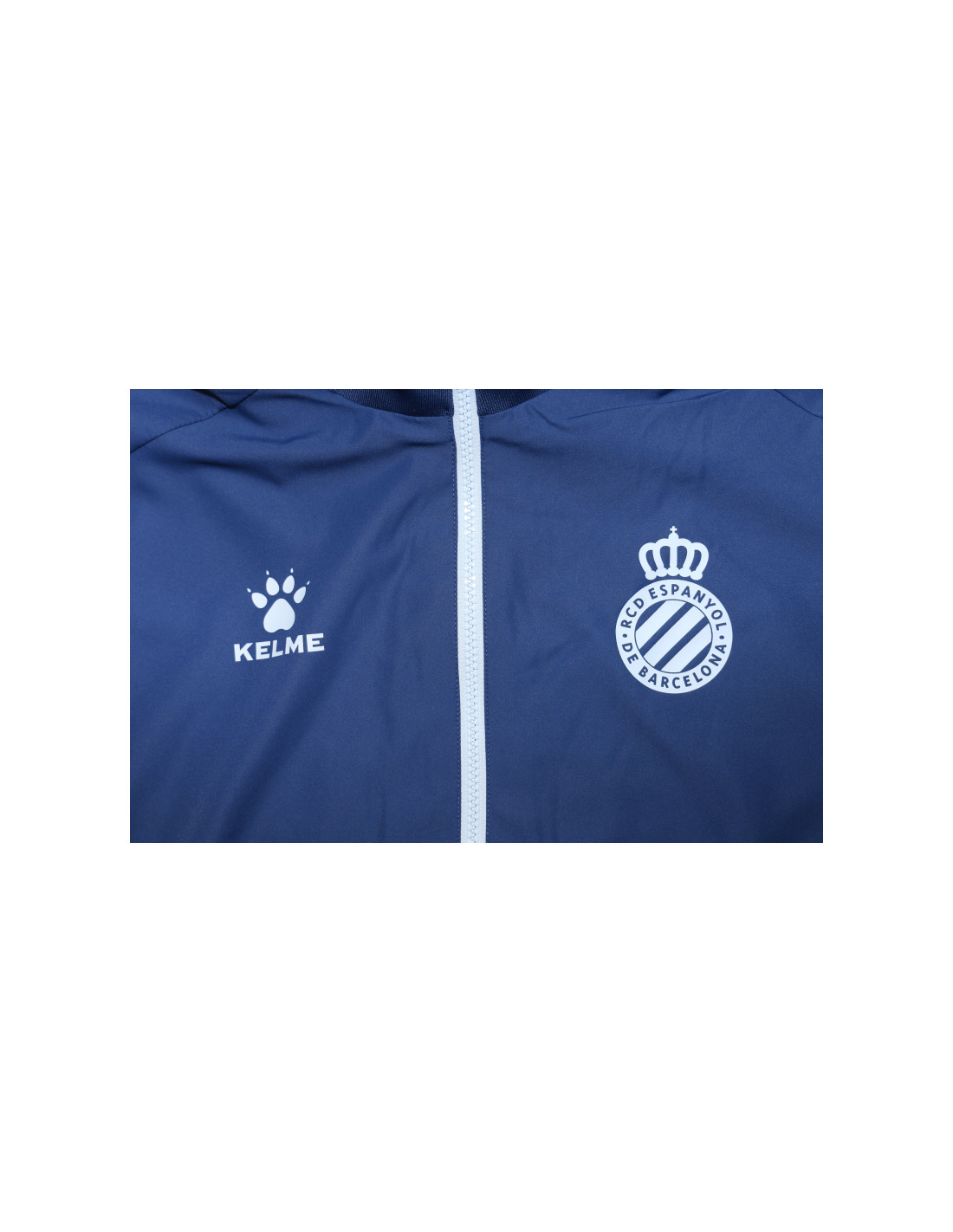 La chaqueta de chándal prepartido del RCD Espanyol de Barcelona en azul navy es la prenda que acompaña a nuestros jugadores en los momentos previos al salto al terreno de juego.