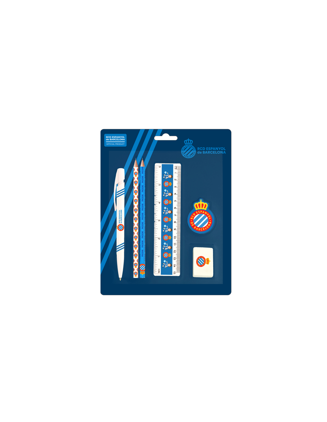 Blister “Vuelta al cole” del RCD Espanyol con material escolar oficial, formado por bolígrafo, lápices, regla, sacapuntas y goma de borrar. Ideal para que el pequeño Perico empiece el cole.