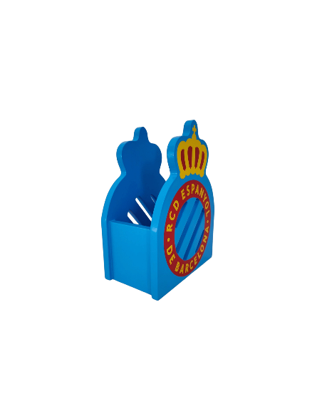 Cubilete de madera con el escudo del RCDE Espanyol, diseñado para mantener tus lápices organizados mientras muestras con orgullo tu pasión blanquiazul.
