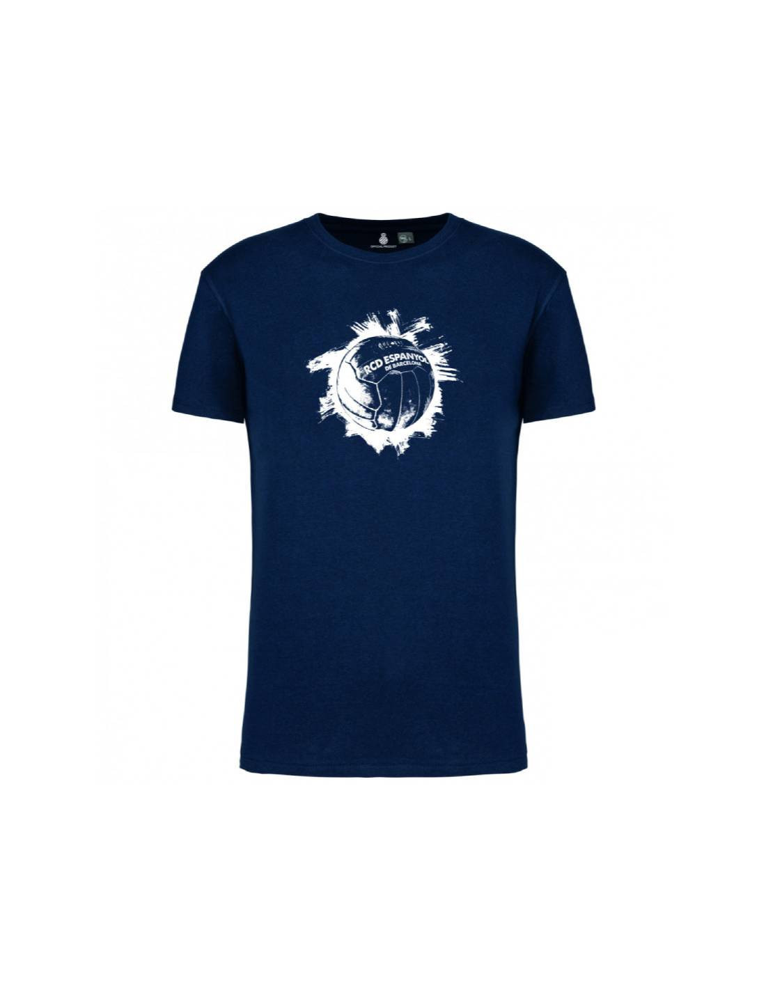 Su diseño destaca por un impactante gráfico central en blanco con un balón vintage, acompañado del nombre del RCD Espanyol de Barcelona, sobre una base azul navy que transmite fuerza y elegancia.