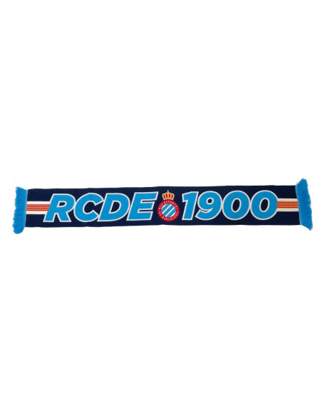 Bufanda oficial del RCD Espanyol con diseño HD que incluye las letras RCDE, el escudo del club y el año 1900. Ideal para mostrar tu pasión por el equipo con estilo moderno.